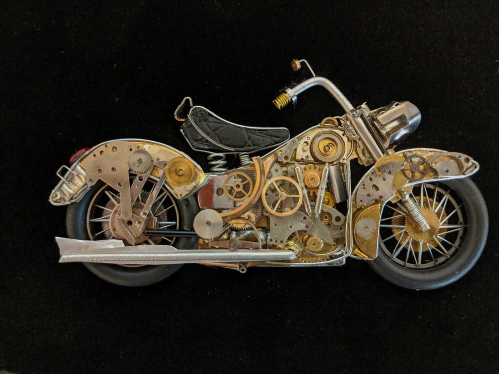I am an artist living in the DC area since 2008. More than 50 years ago my father-in-law, a self-taught artist, started creating these unique pieces with vintage watches, mostly focusing on recreating antique vehicles. Sharing my own fascination with the way music's tempo sets the mood, I combined these inspirations to create instruments from recycled watch parts. My hope is that these pictures not only transmit my fascination with time and movement but also spark personal connections and interpretations in the minds of viewers. All my pieces are the result of combining imagination, patience and watch parts. Disassembling antique watches reveal the tiny pieces that reassemble in recycled timeless artwork.